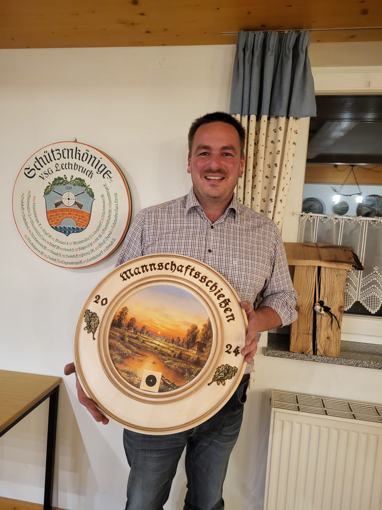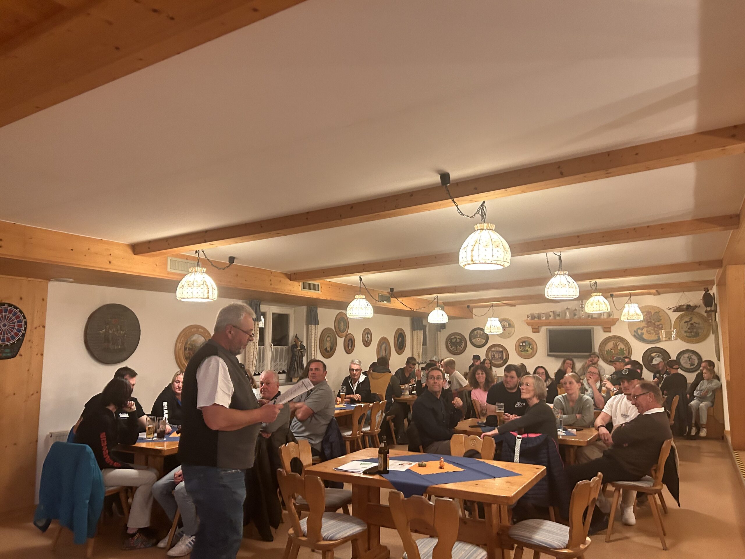 Vom 23 -25.10 fand wieder unser Mannschaftspreisschießen statt. An diesen Tagen konnten die Mannschaften entweder trainieren oder gleich ihre Schüsse für die Wertung abgeben. Auch heuer wurde der Wettkampf wieder gut angenommen und so waren es am Schluss 24 Teams bzw. insgesamt 115 Schützinnen und Schützen die teilgenommen haben. Gleich am Samstag, den 26.10, fand die Siegerehrung bei uns im gut gefüllten Schützenheim statt. Kulinarisch wurden wir hier bestens von Rainer Welz, Berni Sitter und Team versorgt. Gespannt lauschten die Teilnehmer wie die Platzierungen sind. Dem Golfclub auf der Gsteig gelang es ihren Titel vom letzte Jahr zu verteidigen und sie wurden mit 742 Ringen Platz 1. Diese erhielten, wie auch schon im letzten Jahr, einen Präsentkorb vom Käsehaus Hochalp (Leider haben wir von der Übergabe kein Bild -hier bitten wir um Entschuldigung). Über einen Gutschein vom Lechbrucker Hof konnte sich der 2. Platz, die Scheibenknaller mit 697 Ringen freuen. Platz 3 ging mit 695 Ringen an die Kitzretter Lechbruck e.V., die einen Gutschein vom Bootshafen Lechbruck erhielten. Die Plätze 4 -23. erhielten auch alle verschiedene kleine Preise, wie Gutscheine vom Eiscafe Venezia, Unter Palmen, für unseren Adventsmarkt, oder für unser Kesselfleischessen. Der letzte Platz erhielt traditionsgemäß einen Eimer Farbe und kleine Pinsel – sie haben die Ehre den Schießstand wieder zu streichen. Heuer haben diese verantwortungsvolle Aufgabe die Trachtler mit 608 Ringen erhalten. Aber nicht nur die besten Mannschaften wurden geehrt, sondern auch der oder die Schütz/in mit dem besten Teiler. Hier nochmal kurz ein kleiner Exkurs – Was ist überhaupt ein Teiler: Ein Teiler gibt an, wie viel hundertstel Millimeter man von der Mitte der Scheibe weg ist. So ist bei beispielsweise ein 78 Teiler 0,78mm vom Scheibenmittelpunkt entfernt. Mit einem sensationellem 2,2 Teiler gewinnt Stefan Hack einen wunderschöne Schützenscheibe.